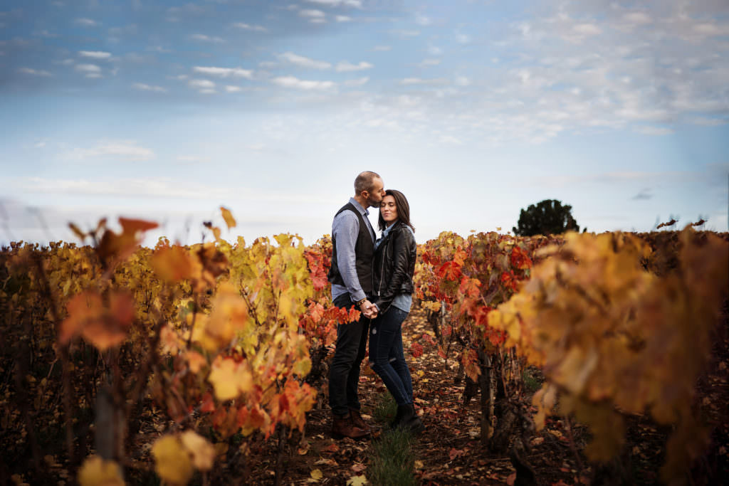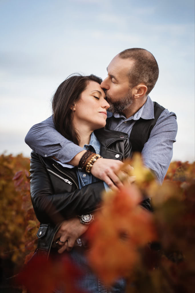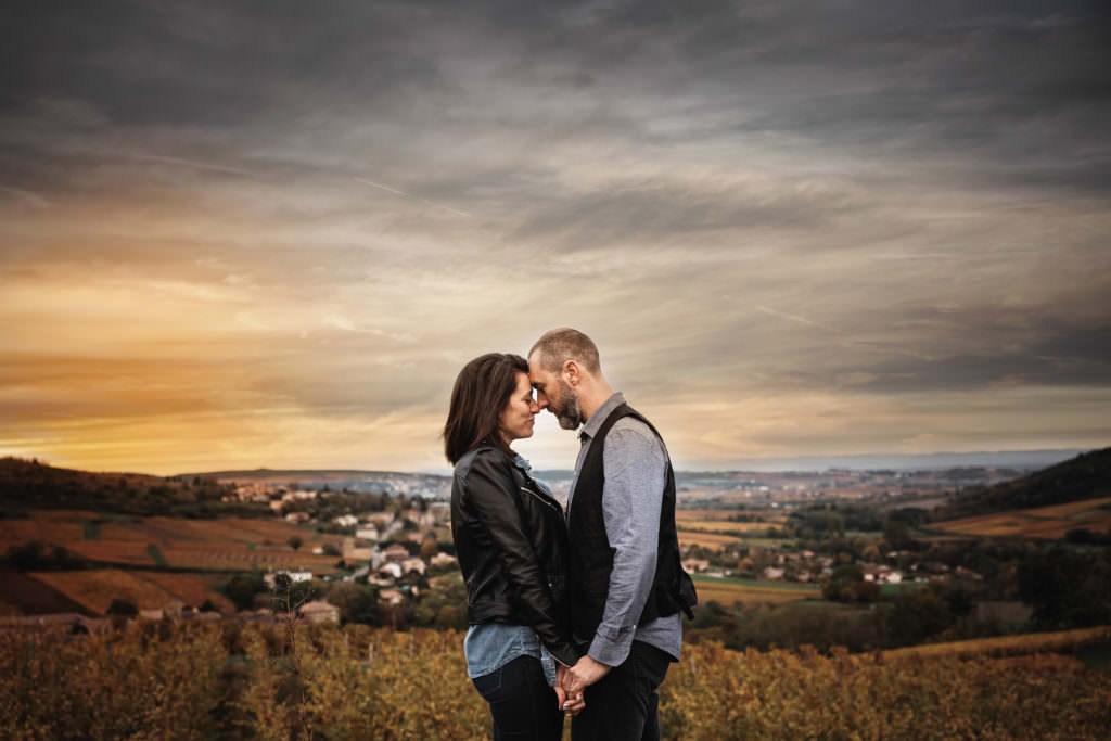 J’ai donc été présente à la mairie, pour réaliser leur photo de mariage à Charnay les Mâcon. C’est le lendemain en fin de journée que nous avons réalisé la séance photo couple à Mâcon. C’était mon rêve de faire une séance dans les vignes en automne.