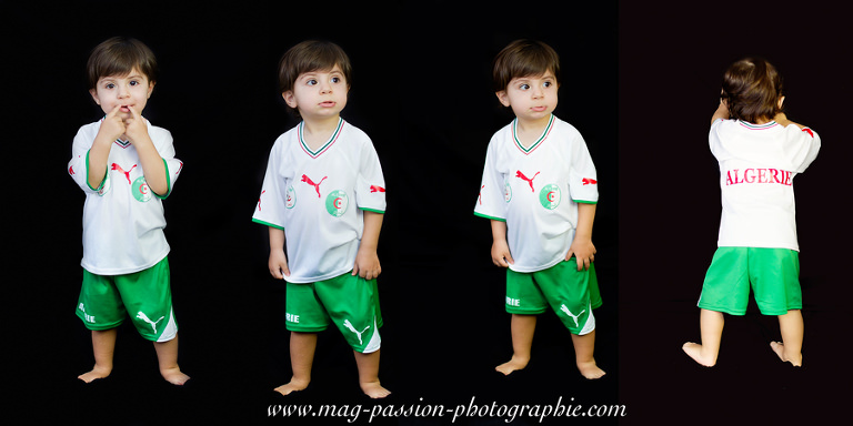Issa est un petit garçon d’origine algérienne. Sa maman a voulu mettre en avant sa culture par les accessoires qu’elle avait sélectionné pour la séance. C’est donc dans la bonne humeur que Issa a posé avec la tenu du club de foot de son pays mais aussi en habit traditionnel.